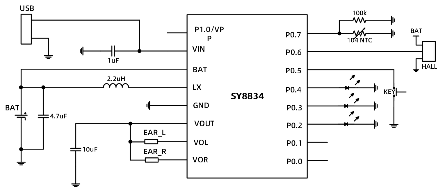 SY8834是专门为TWS耳机充电仓设计的全集成SoC芯片。SY8834内部集成了兼容8051指令集的CPU,256字节RAM, 4k字节OTP程序存储区,多通道10位ADC,9个GPIO,一个线性充电模块,一个Boost升压模块和两个独立放电控制MOS管。SY8834芯片VIN管脚支持过压保护,最高耐压可达35V。