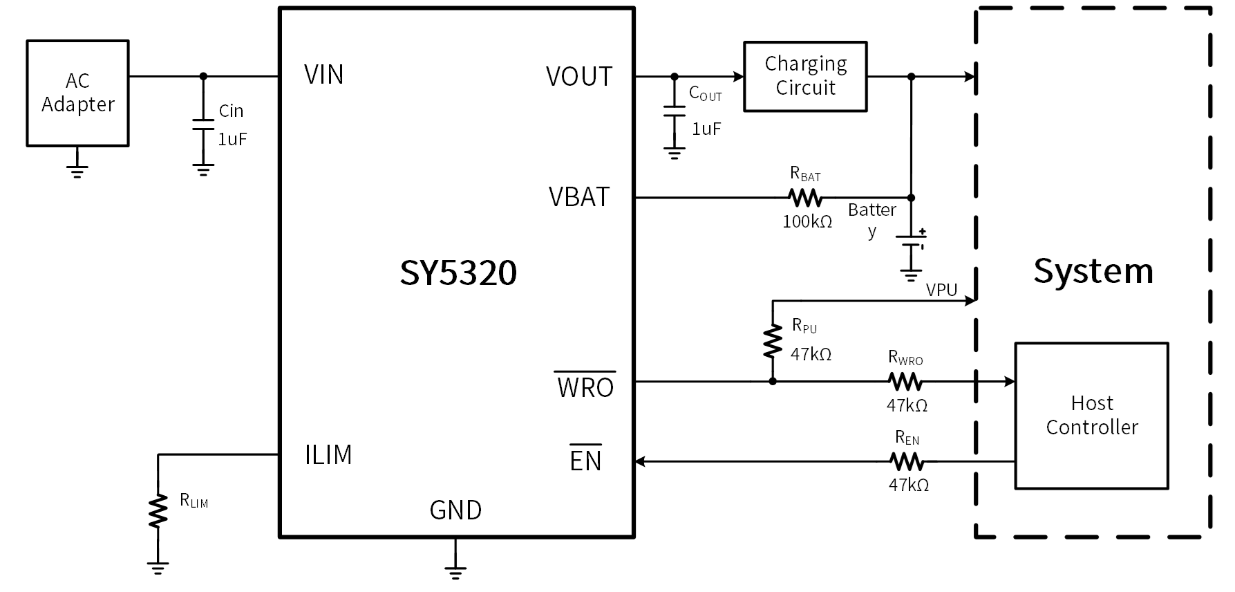 The SY5320 is a highly integrated circuits with input under-voltage and over-voltage protection, battery over-voltage protection, abnormal load current protection, over temperature protection. SY5320 is used at the front end of charging circuits or low-voltage systems, it can withstand high input voltages up to 28V. When the input voltage exceeds the overvoltage protection threshold, the internal MOSFET will be turned off within 1μs to protect the back-end low-voltage system. When the battery voltage exceeds 4.45V, the IC will turn off the MOSFET to protect the lithium battery. The IC will limit the input current to a safe value by using the external resistance between ILIM and GND.