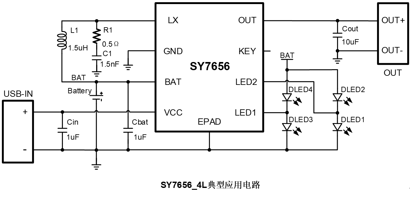 KEY键及LED指示,可订制版本及功能——SY7656_2L:无需接KEY键,升压常输出,轻载自动关闭LED显示;2颗LED充/放电状态指示; SY7656_KEY2L:单击KEY键显示电量并启动/关闭升压,自动关机功能(VOUT掉到0V);2颗LED充/放电状态指示; SY7656_4L: 无需接KEY键,升压常输出,轻载自动关闭LED显示;4颗LED充/放电状态指示; SY7656_KEY4L:单击KEY键显示电量并启动/关闭升压,自动关机功能(VOUT掉到0V);4颗LED充/放电状态指示。