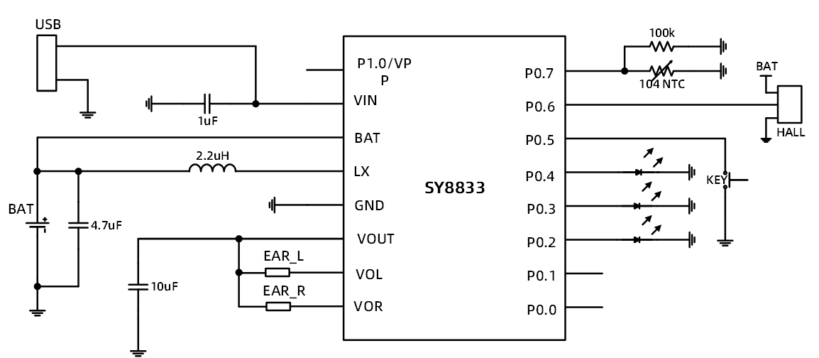 SY8833是专门为TWS耳机充电仓设计的全集成SoC芯片。SY8833内部集成了兼容8051指令集的CPU,256字节RAM, 4k字节OTP程序存储区,多通道10位ADC,9个GPIO,一个线性充电模块,一个Boost升压模块和两个独立放电控制MOS管。SY8833为SOP16封装。