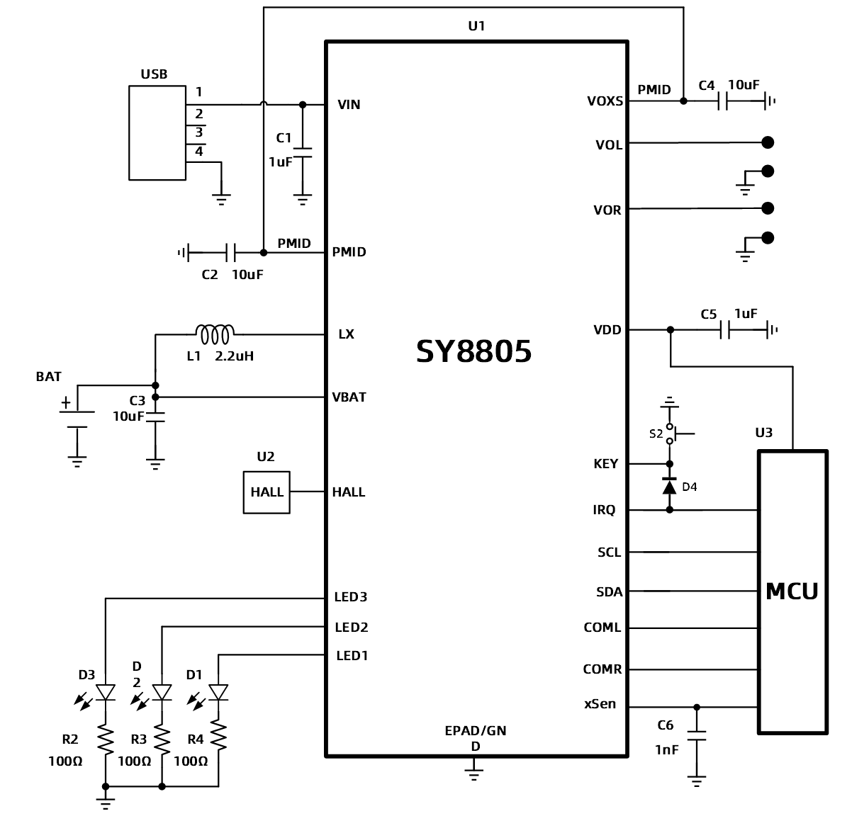 SY8805集成了标准的I2C接口,方便实现芯片和MCU之间的通信,控制充电、放电功能。