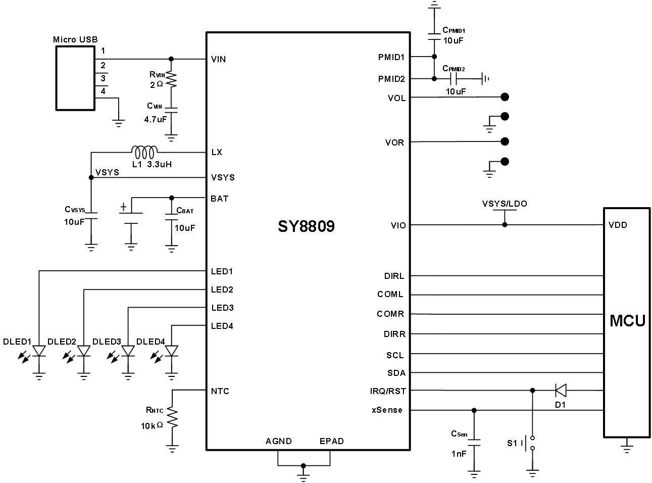 SY8809集成了标准的I2C接口和中断信号,方便实现芯片和MCU之间的通讯,控制充电、放电功能。